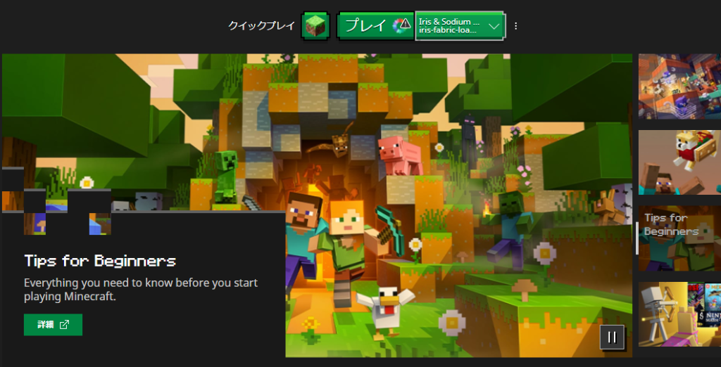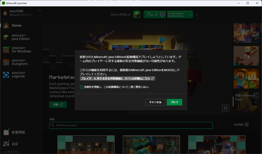 - Minecraftを起動すると「プレイ」の右が「Iris & Sodium…」と変わっていました。「プレイ」をクリックします。注意書きが出ますのでチェックして「プレイ」。