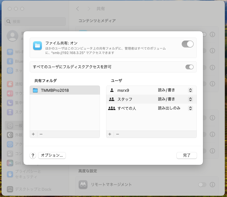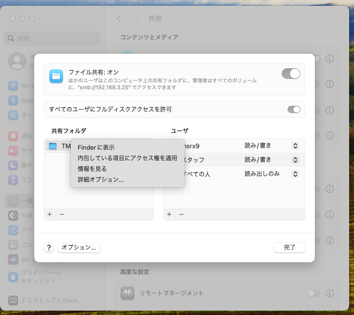 (i)をクリックします。共有フォルダ「TMMBPro2018」を右クリックして「詳細オプション」を表示します。
