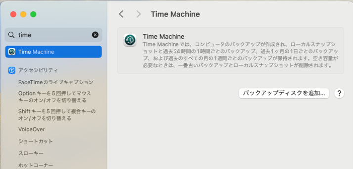 - Time Machine設定を開いて「バックアップディスクを追加」をクリックします。
