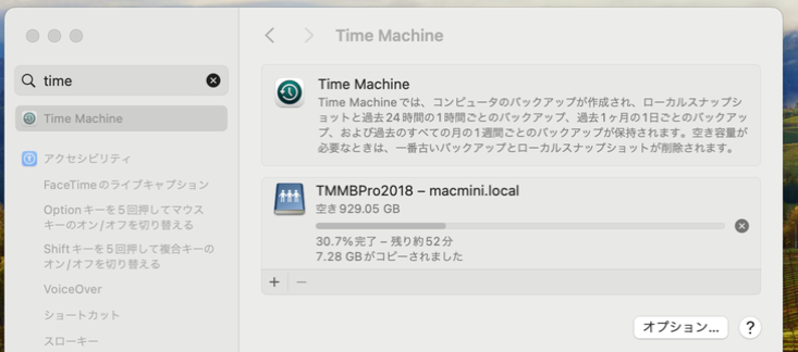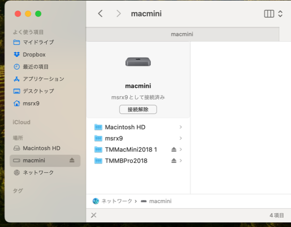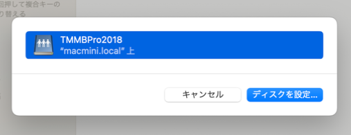 - MacMiniに接続をしてTimeMachineのデータ保存先として使用する「TMMBPro2018」にアクセスできる状態にします。