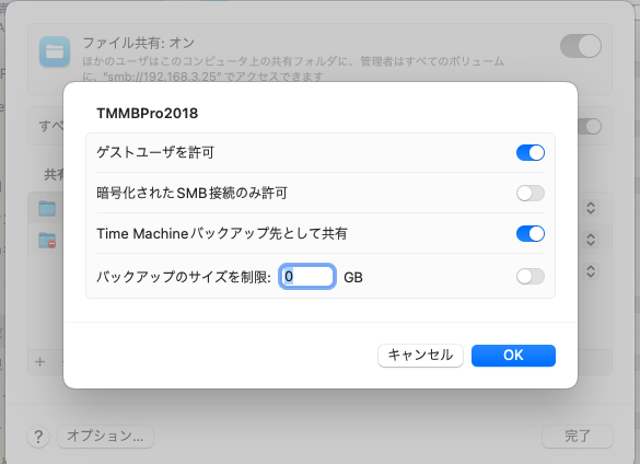 出来ませんでした。それぞれ別の専用パーティションにする必要があります。 「Time Machineバックアップ先として共有」や「バックアップのサイズを制限」とかオプションがあるので複数のバックアップを置けるのかなと思ったのですが、すでにサーバ側でTimeMachineのバックアップ先として指定しているパーティションにクライアント側のバックアップを取ろうとすると以下のようなエラーが出てダメでした。専用パーティションにしてからこれらのエラーはでなくなりました。